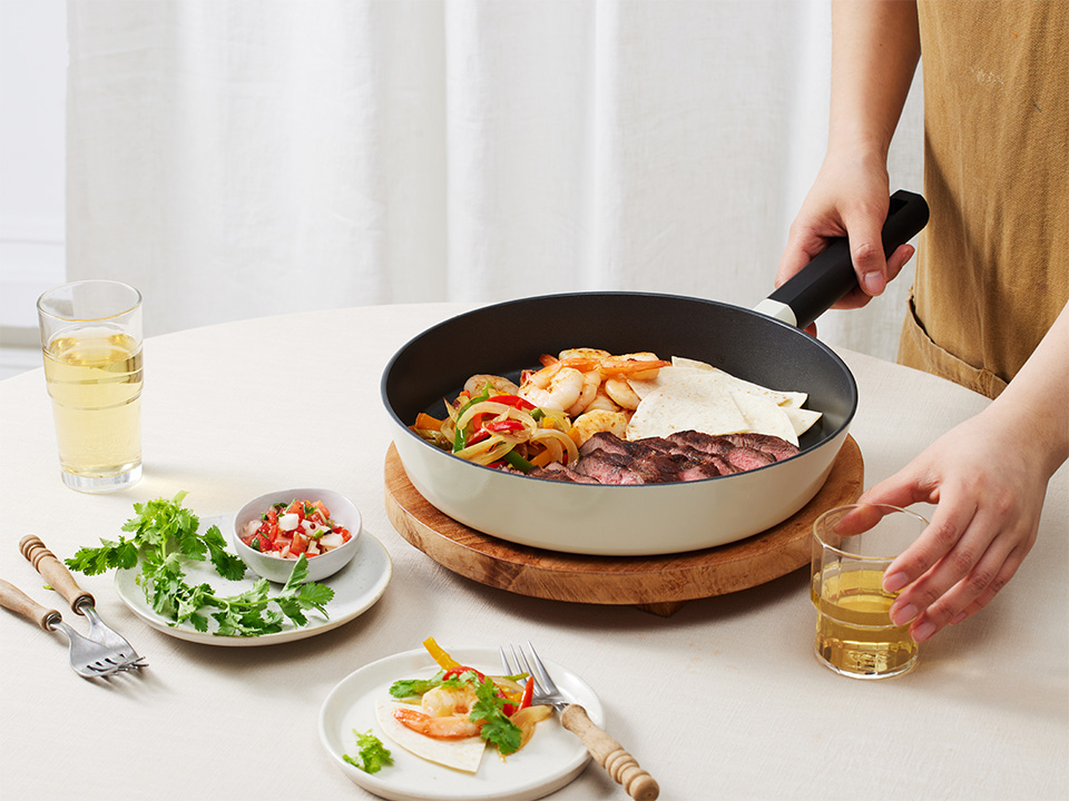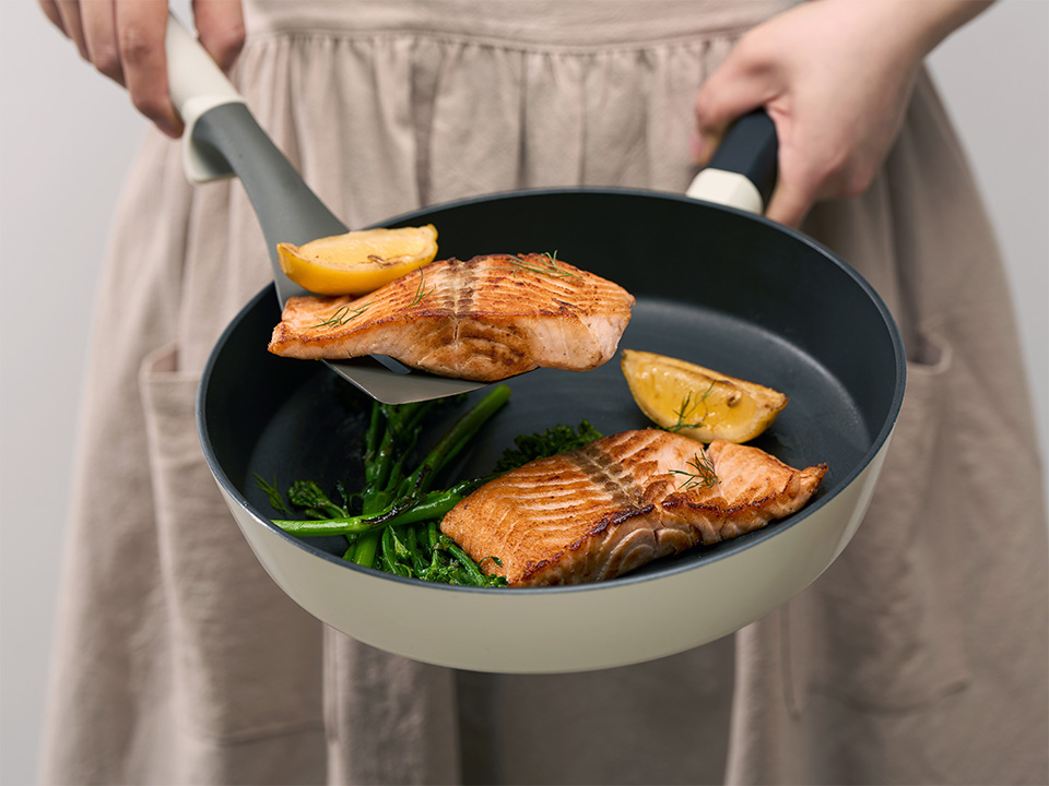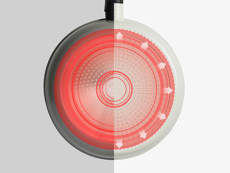 Featuring a base 4cm wider than typical pans of the same size, it lets you cook larger portions more efficiently and with greater ease.
