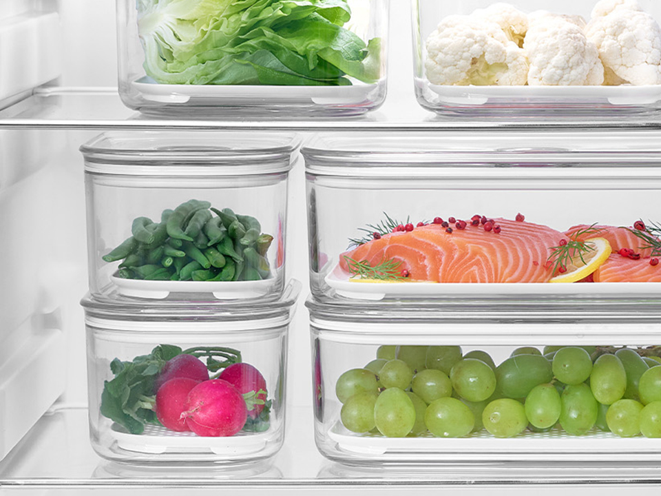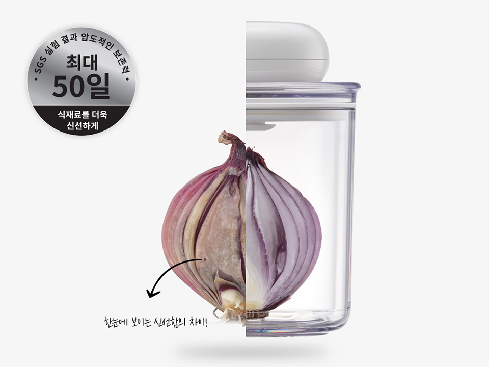 이중구조 밀폐 방식으로 외부 공기와 수분을 차단해 최대 50일까지 신선하게 보관할 수 있습니다. 음식물 냄새 배임 방지 / 냉장고 내 이취 차단