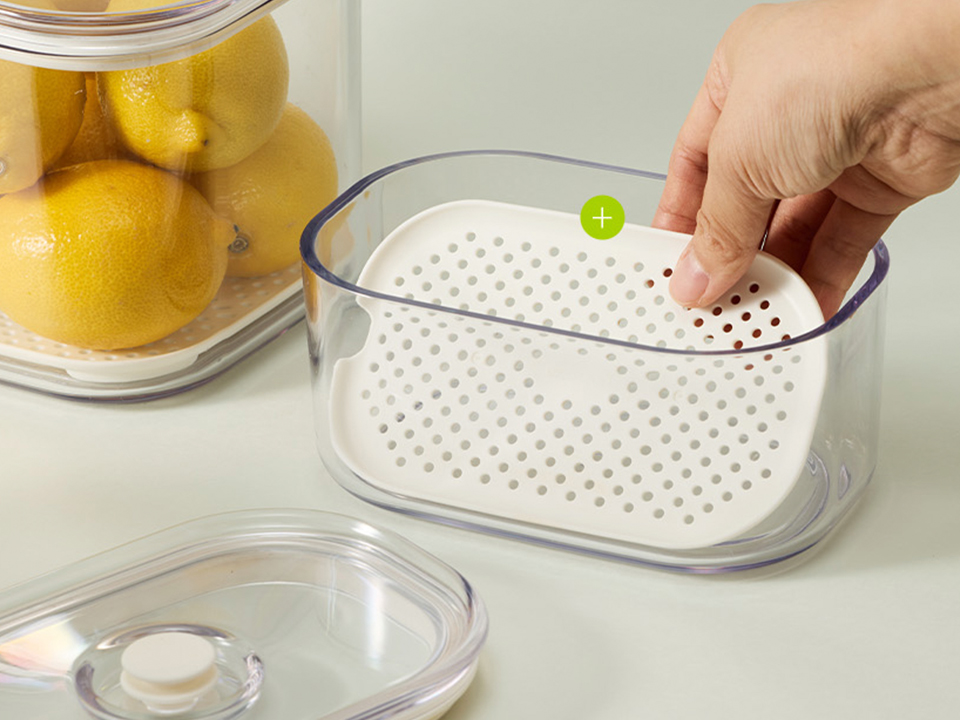 바닥 트레이가 물빠짐을 도와 식재료를 더욱 신선하게 유지할 수 있습니다.