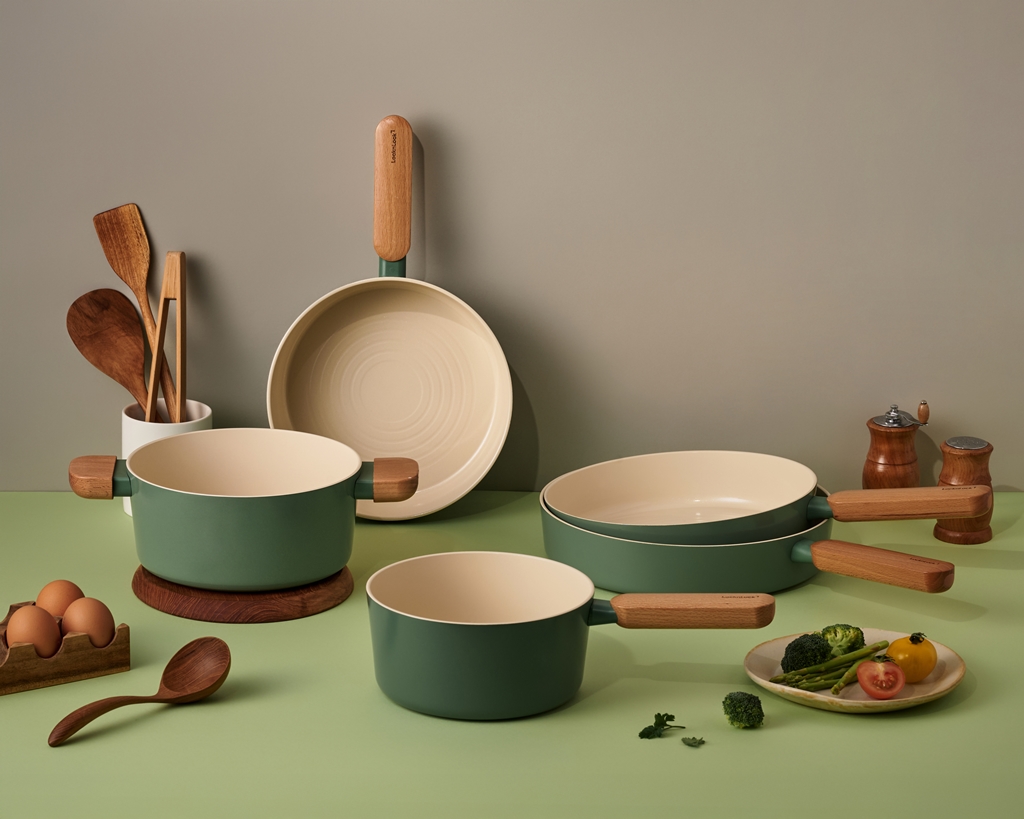 트렌디한 그린 컬러와 우드 핸들의 조화로 어느 주방에나 잘 어울리며, 냄비 4종과 프라이팬 3종으로 구성되어