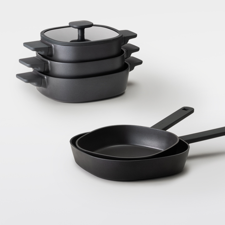 네모난 주방환경과 어울리는 안정적인 디자인의 통주물 쿡웨어