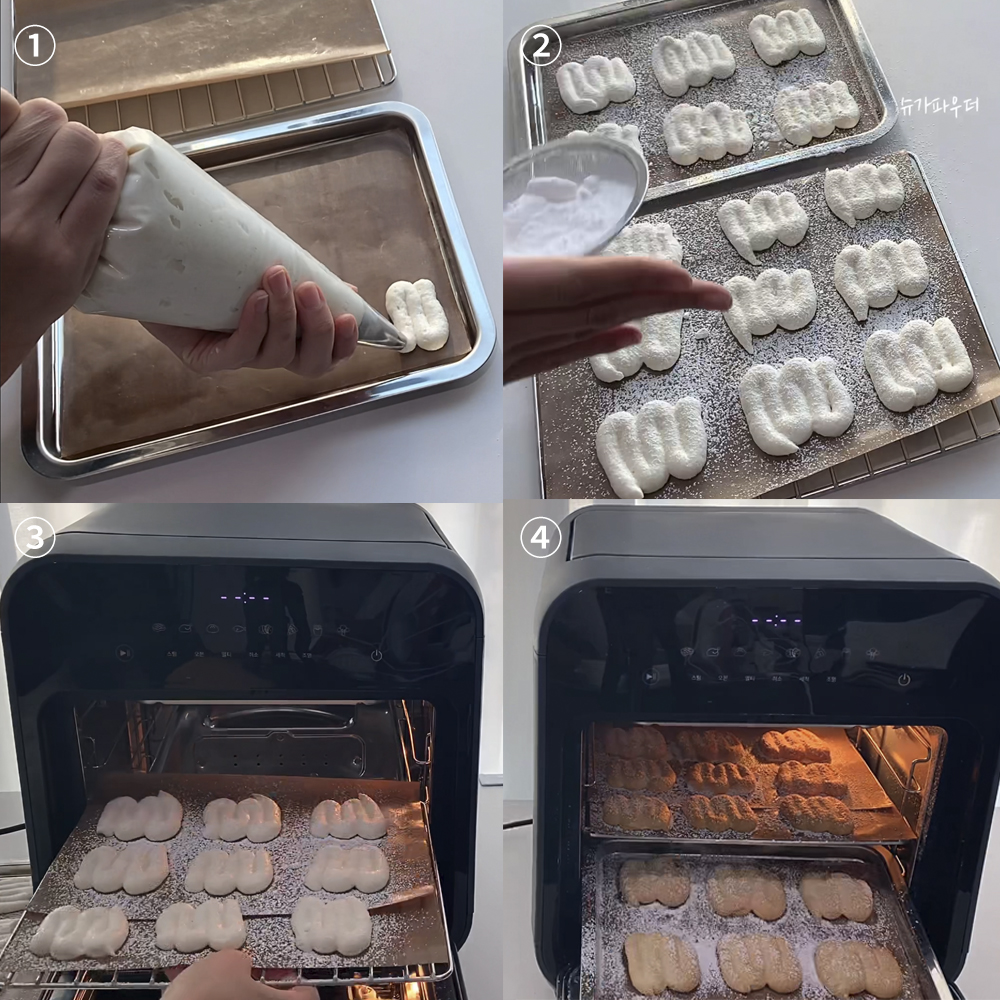 그릴과 평철판에 실리콘 페이퍼를 깔고 다쿠아즈반죽을 짠 뒤, 슈거파우더를 뿌려주세요.