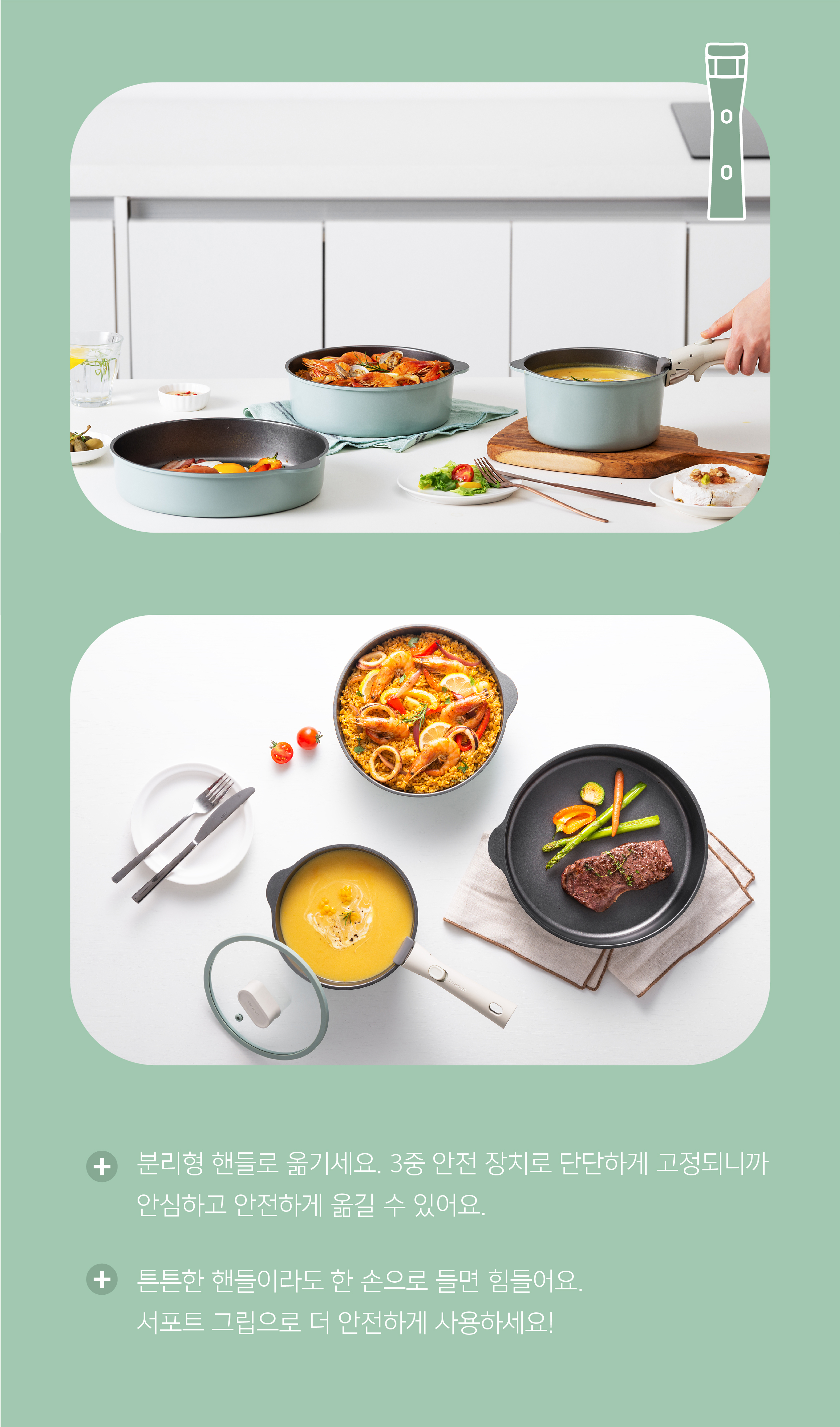 18cm 냄비, 22cm 멀티팬, 26cm 프라이팬 3종 구성으로 국물 요리부터 구이, 볶음, 전골, 파스타까지 다양하게 조리할 수 있어요!
